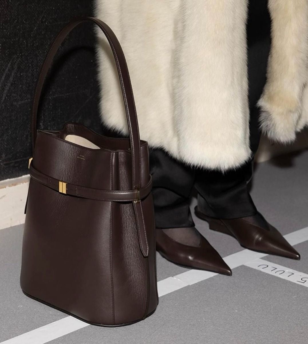 Crafted from lightly textured Palmellato leather and trimmed with gold-tone hardware, the Belted Thérisse Bag offers both elegance and versatility. Its chic belt detail allows you to cinch the flattened bucket silhouette for a refined shape or leave it open for added space. Inside, two slip pockets keep your essentials organized. Perfect for city outings, it can be worn effortlessly over the shoulder.
